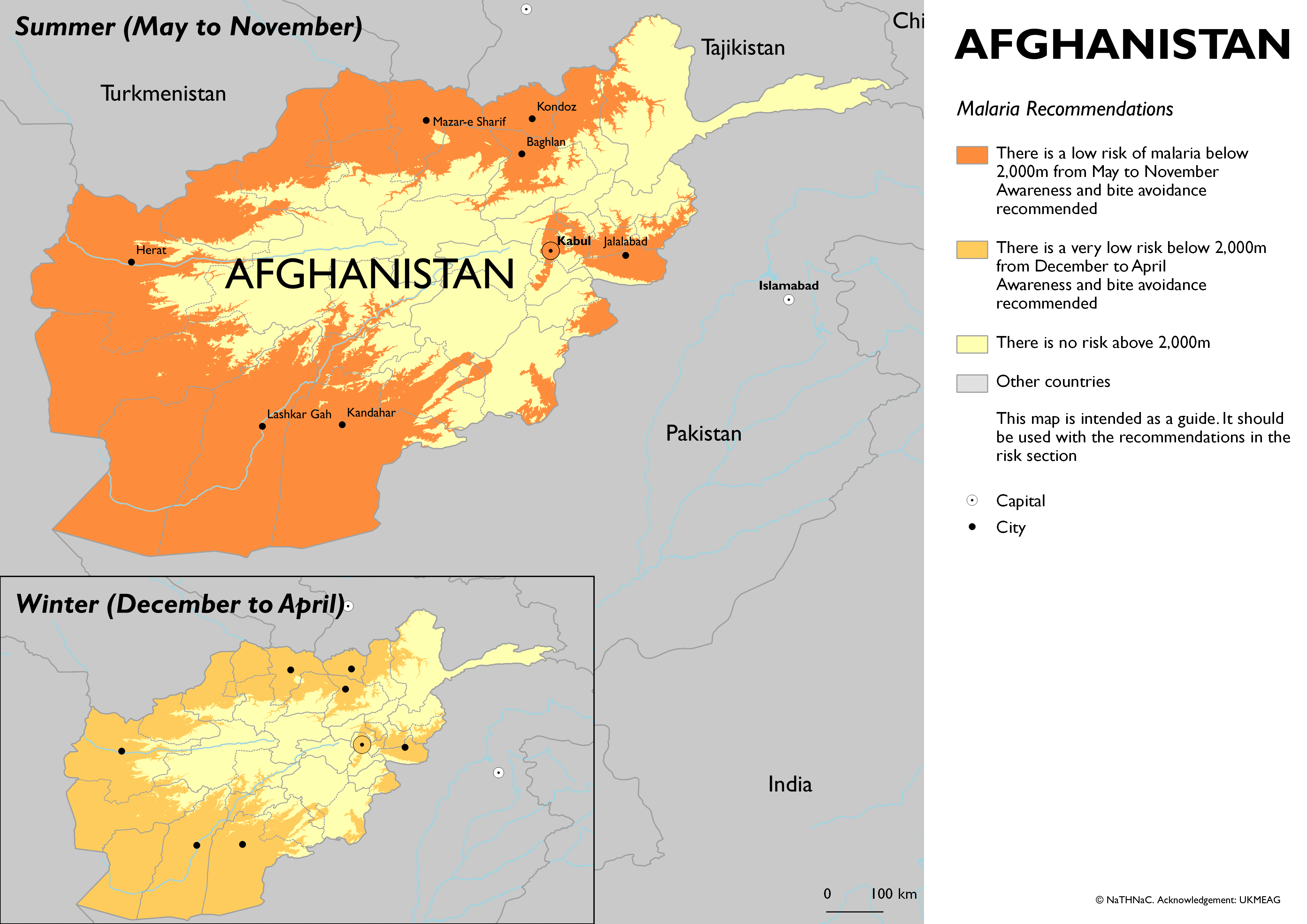- There is a low risk of malaria below 2,000m from May to November: awareness of risk and bite avoidance recommended. There is a very low risk of malaria in this part of the country during the rest of the year: awareness of risk and bite avoidance recommended.