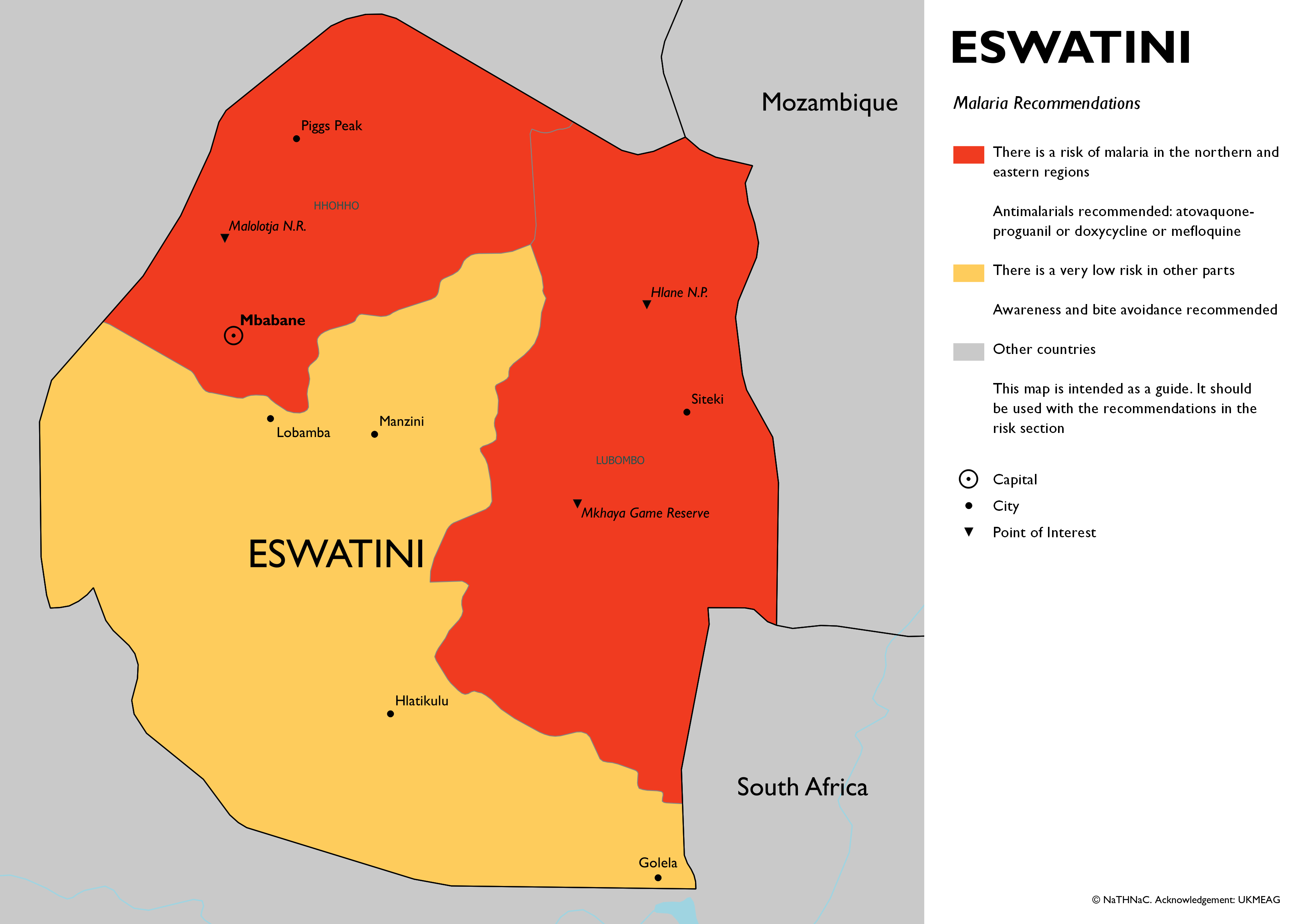 The recommended antimalarials for Eswatini are listed below. They are recommended for certain areas only (see description of risk areas above). If these are not suitable please seek further specialist advice.