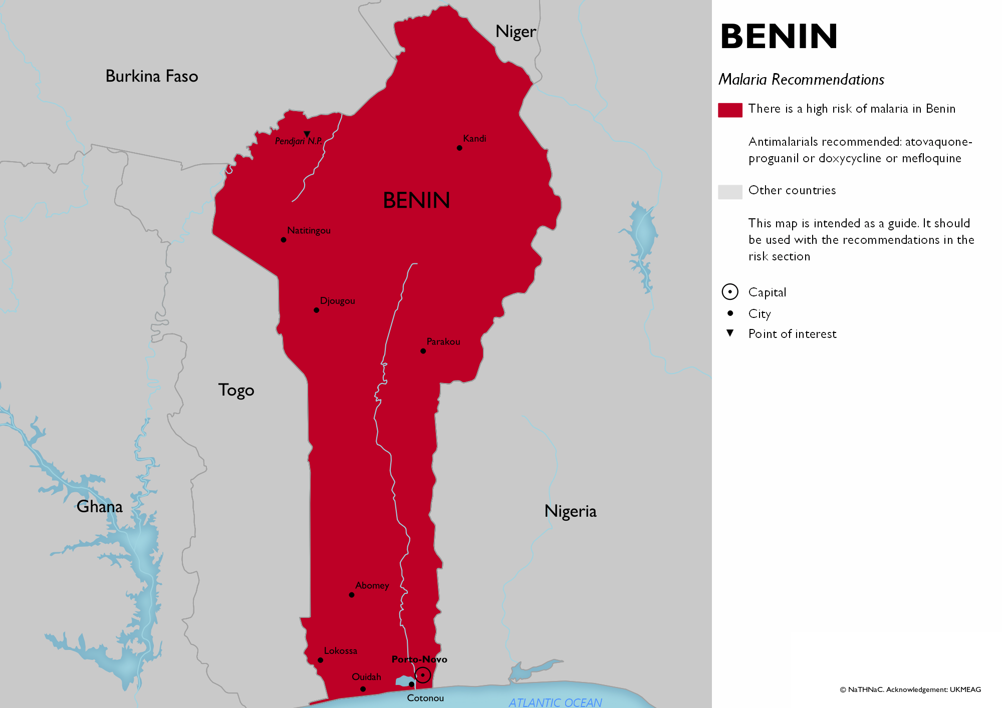 - There is a high risk of malaria in Benin: atovaquone/proguanil OR doxycycline OR mefloquine recommended.