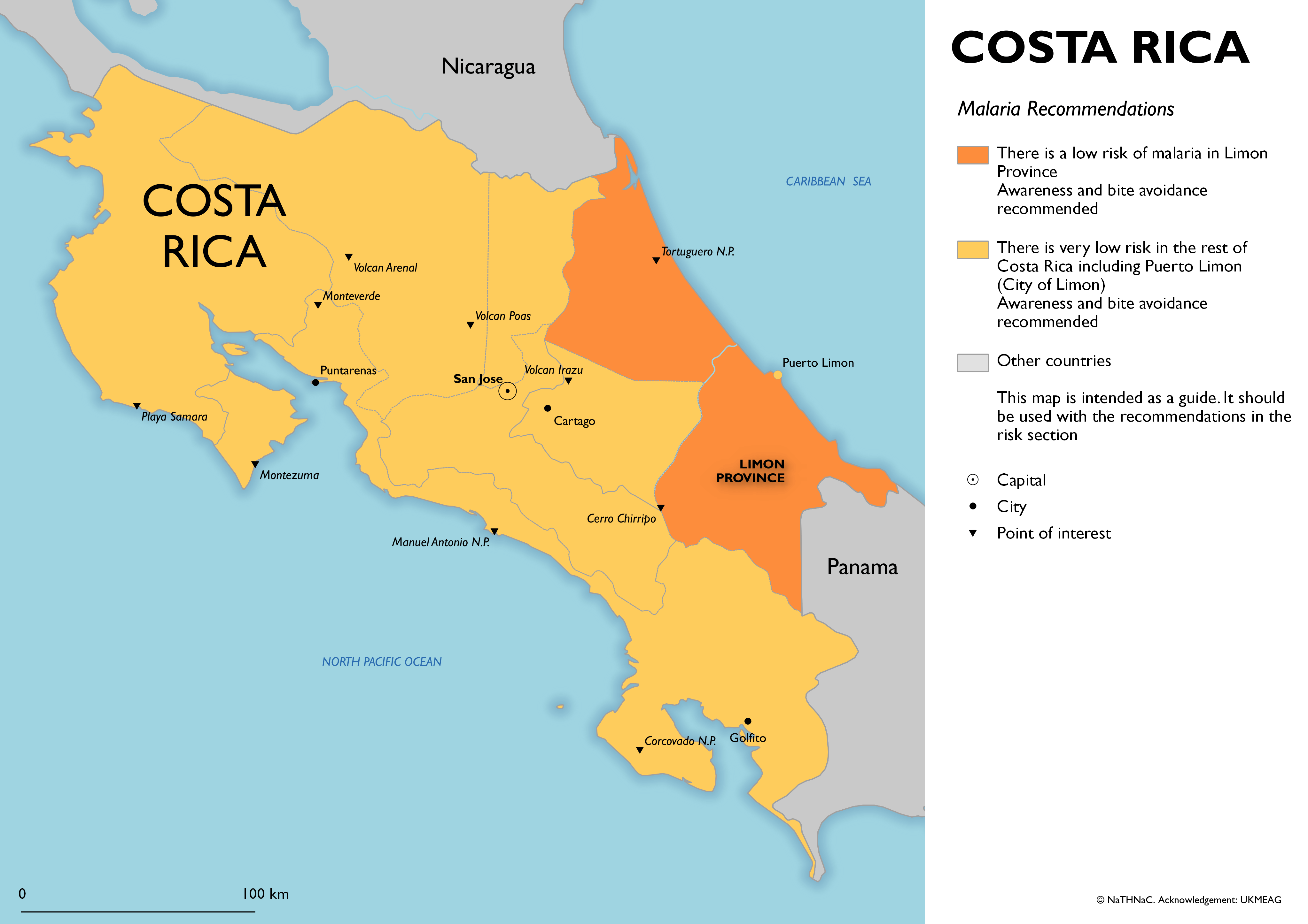 - There is a low risk of malaria in Limon Province (but not in the city of Limon (Puerto Limon): awareness of risk and bite avoidance recommended.